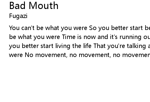 | You can't be what you were So you better start being just what you are You can't be what you were Time is now and it's running out You can't be what you were So you better start living the life That you're talking about You can't be what you were No movement, no movement, no movement In a bad mouth It betrays a bad mind |