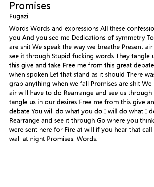 Words Words and expressions All these confessions Of where we stand How I see you And you see me Dedications of symmetry Together we will be forever. Promises are shit We speak the way we breathe Present air will have to do Rearrange and see it through Stupid fucking words They tangle us in our desires Free me from this give and take Free me from this great debate There were no truer words than when spoken Let that stand as it should There was nothing left when broken We grab anything when we fall Promises are shit We speak the way we breathe Present air will have to do Rearrange and see us through Stupid fucking words They tangle us in our desires Free me from this give and take Free me from this great debate You will do what you do I will do what I do We will do what we do Rearrange and see it through Go where you think you want to go Do everything you were sent here for Fire at will if you hear that call Touch your hand to the wall at night Promises. Words. |