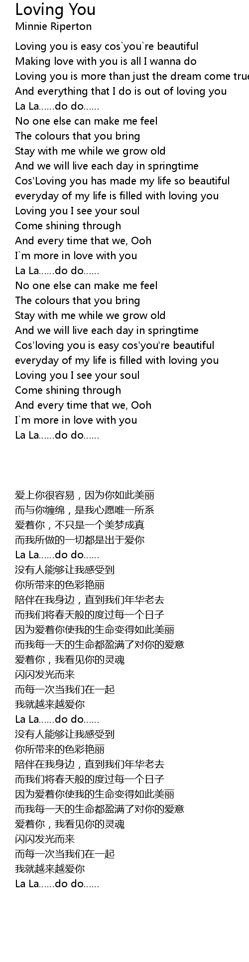 | [00:17.160] | Loving you is easy cos`you`re beautiful |