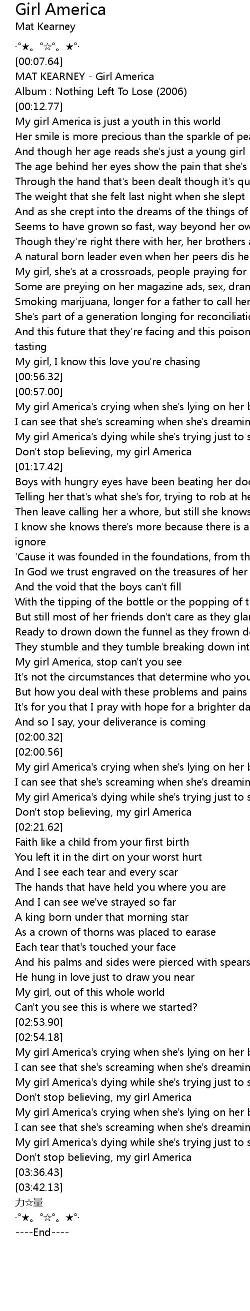 | [03:31.74] | Don't stop believing, my girl America |