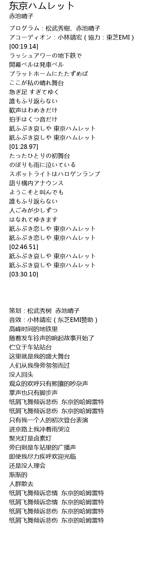 | [03:19.62] | 紙ふぶき哀しや 東京ハムレット |