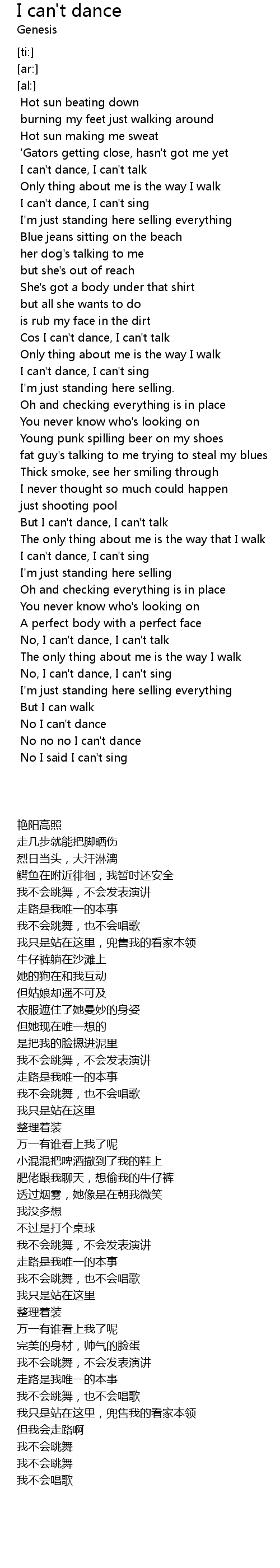 | [01:16.65] | Cos I can't dance, I can't talk |