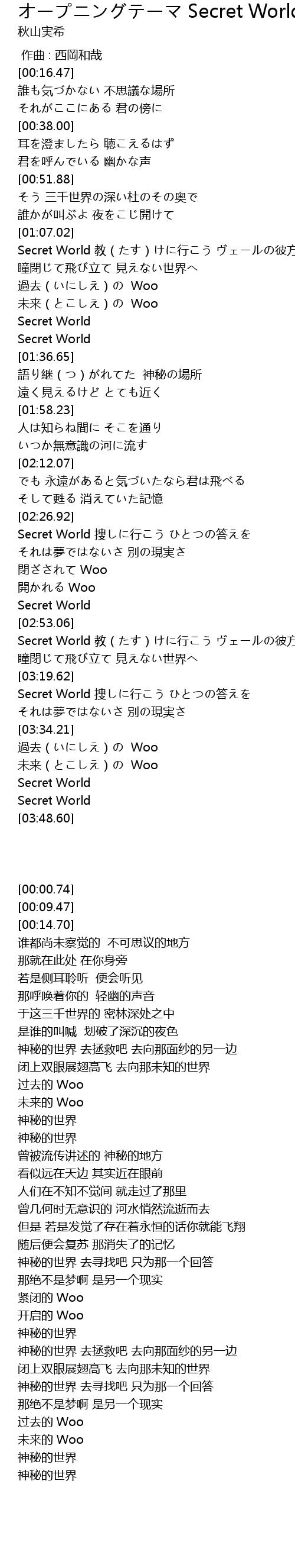 | [03:05.97] | Secret World 教(たす)けに行こう ヴェールの彼方へ |