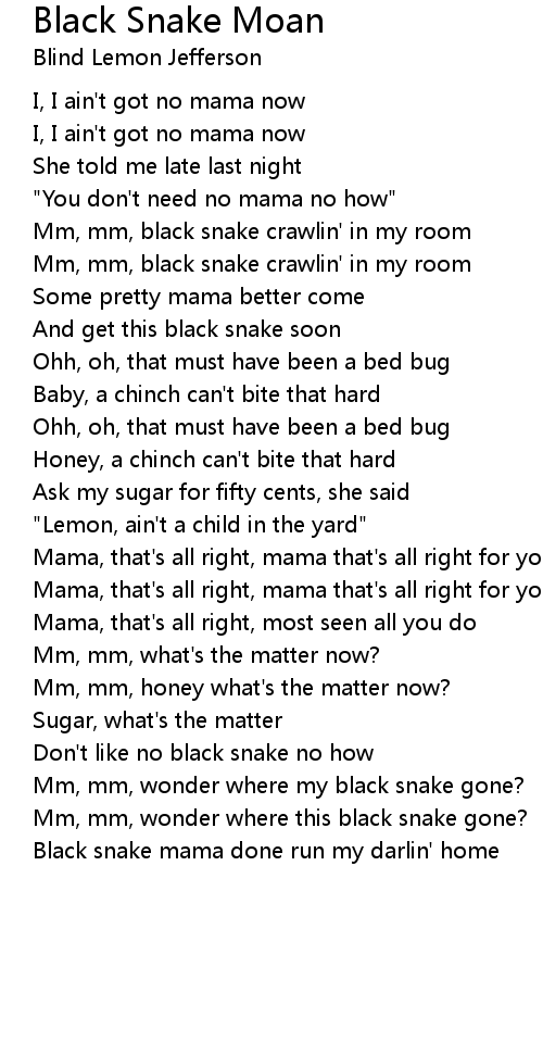 Black snake mama done run my darlin' home |