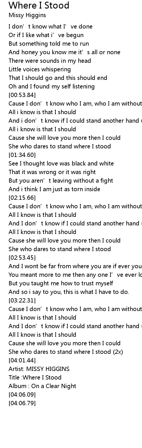 | [04:04.14] | Title :Where I Stood |