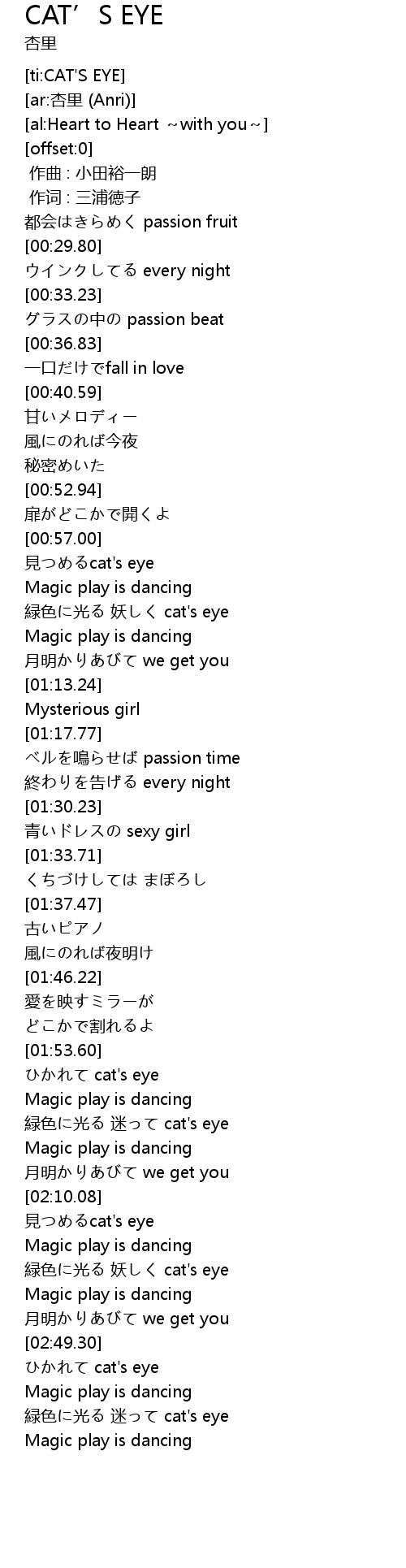 | [02:37.92] | 緑色に光る 妖しく cat's eye |