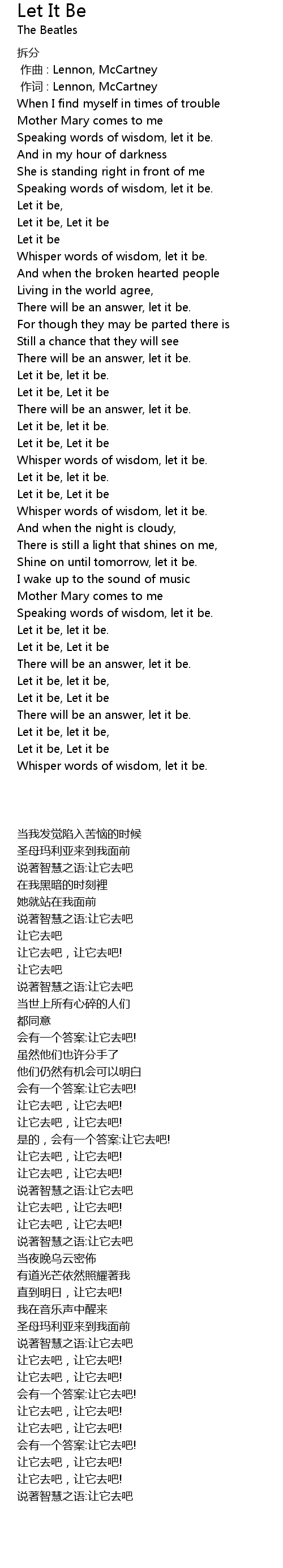 | [00:46.590] | Whisper words of wisdom, let it be. |