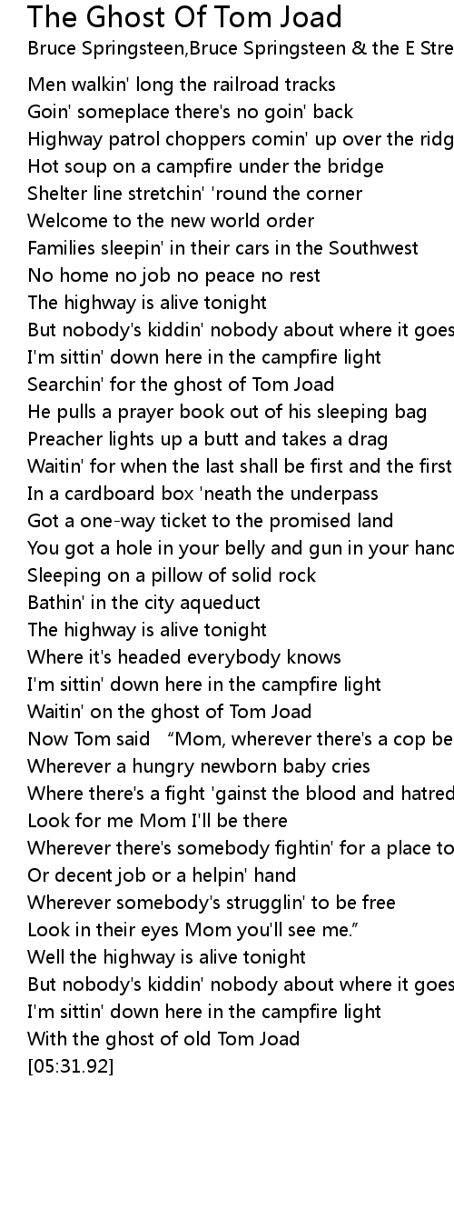 | [01:20.80] | Searchin' for the ghost of Tom Joad |