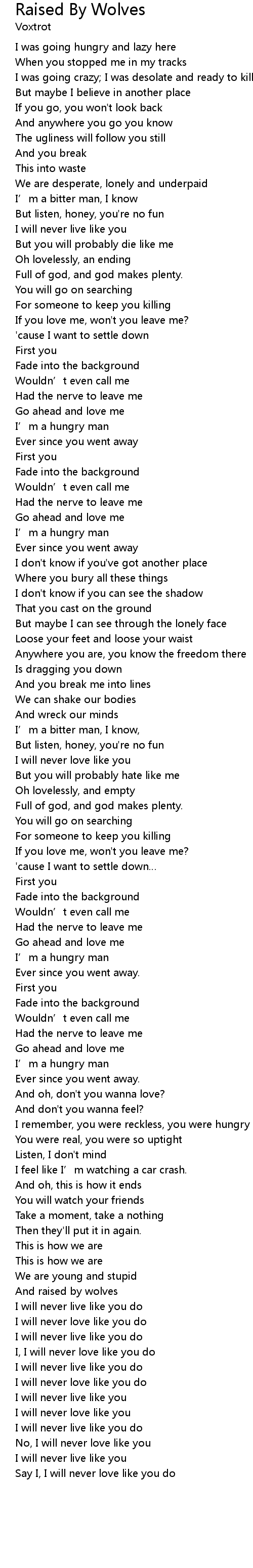 | Song | Raised By Wolves |