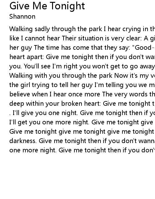Walking sadly through the park I hear crying in the darkness And thought I act like I cannot hear Their situation is very clear: A girl who's trying to tell her guy The time has come that they say: "Good-bye" And his answer tears my heart apart: Give me tonight then if you don't wanna stay Girl I'll just forget you. You'll see I'm right you won't get to go away Love ain't gonna let you. Walking with you through the park Now it's my voice in the darkness. Just like the girl trying to tell her guy I'm telling you we must say "good-bye". I can't believe when I hear once more The very words that were said before - Come from deep within your broken heart: Give me tonight then if you don't wanna stay . . . I'll give you one night. Give me tonight then if you don't wanna stay . . . I'll get you one more night. Give me tonight give me tonight give me tonight Give me tonight give me tonight give me tonight . . . His voice echoes in the darkness. Give me tonight then if you don't wanna stay . . . Yes I'll give you one more night. Give me tonight then if you don't wanna stay |