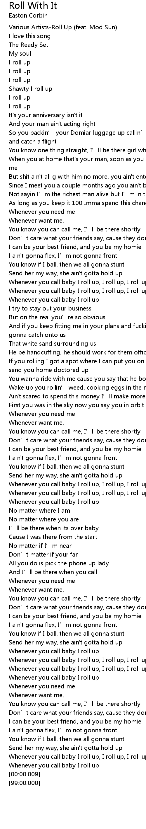 | [01:03.83] | Whenever you call baby I roll up, I roll up, I roll up |