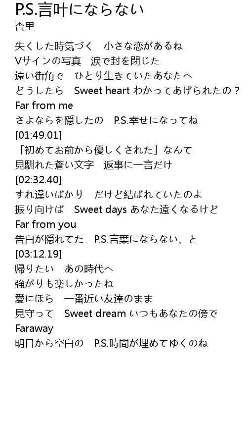 | [04:10.83] | 明日から空白の P.S.時間が埋めてゆくのね |