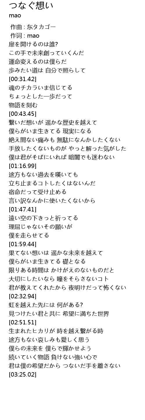 | [00:44.01] | 繋いだ想いが 遥かな歴史を越えて |