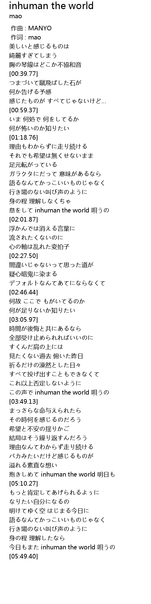 | [05:01.92] | 抱きしめて inhuman the world 明日も |