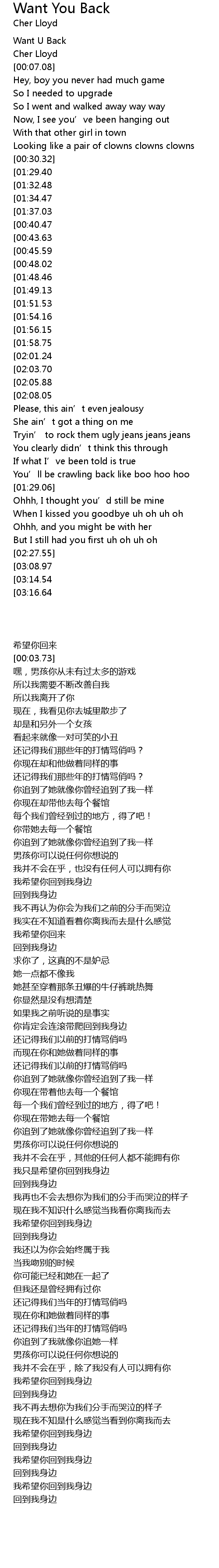 | [02:54.96][01:56.15][00:57.52] | Wawant you, want you back |