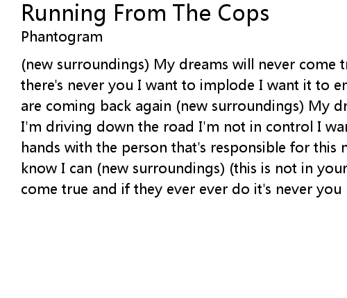 (new surroundings) My dreams will never come true and if they ever ever do there's never you I want to implode I want it to end and all those old feelings are coming back again (new surroundings) My dreams are haunting my soul and when I'm driving down the road I'm not in control I want to let go I want to shake hands with the person that's responsible for this master plan I know I will I know I can (new surroundings) (this is not in your mind) my dreams will never come true and if they ever ever do it's never you |
