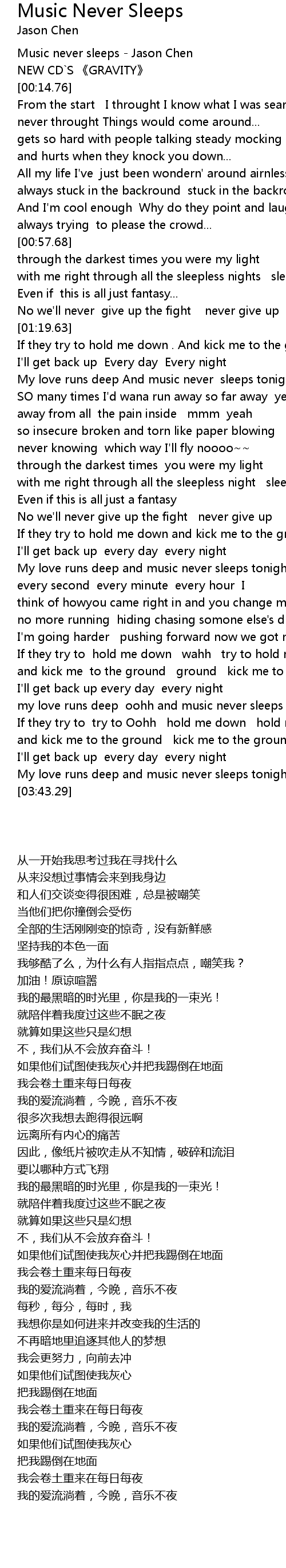 | [00:02.97] | Music never sleeps Jason Chen |