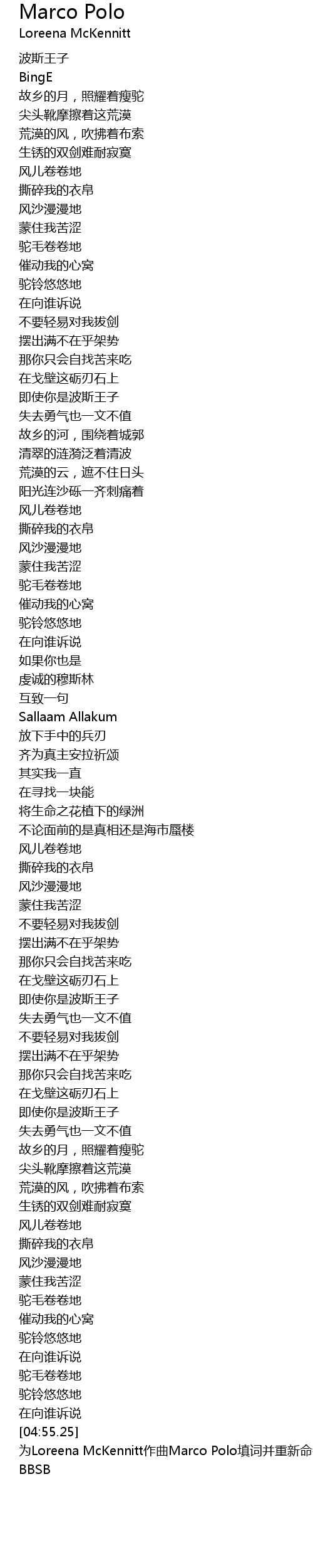 | [04:56.08] | 为Loreena McKennitt作曲Marco Polo填词并重新命名 |