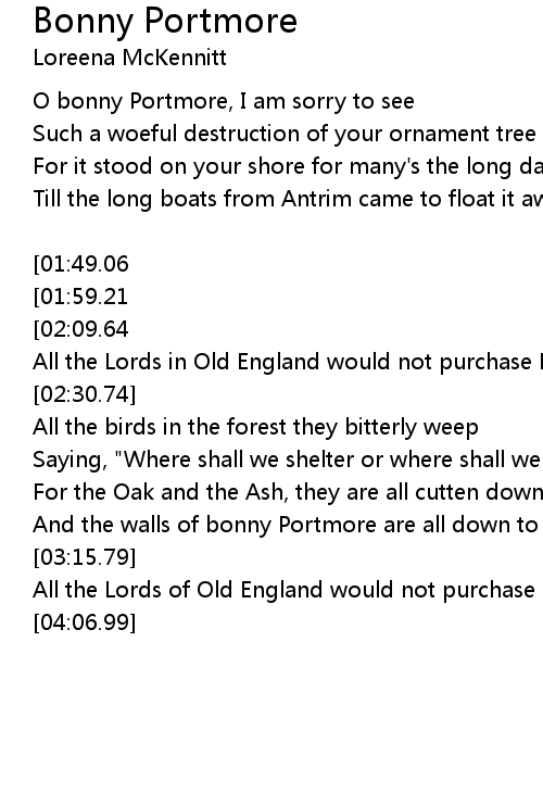 | [03:19.08][01:49.06] | O bonny Portmore, you' re shining where you stand |