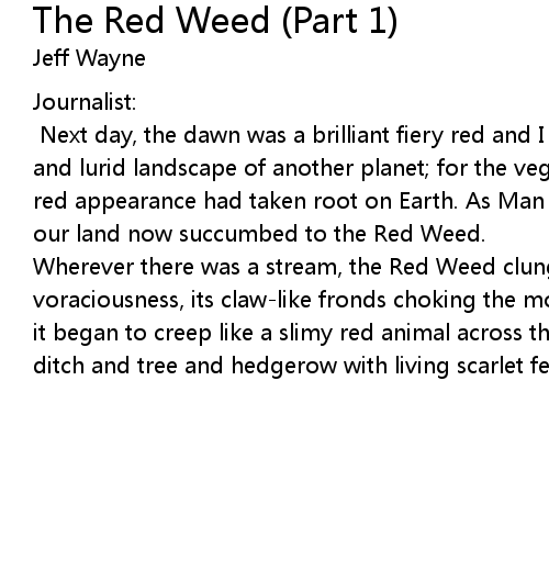 | Wherever there was a stream, the Red Weed clung and grew with frightening voraciousness, its claw-like fronds choking the movement of the water, and then it began to creep like a slimy red animal across the land, covering field and ditch and tree and hedgerow with living scarlet feelers, crawling, crawling! |