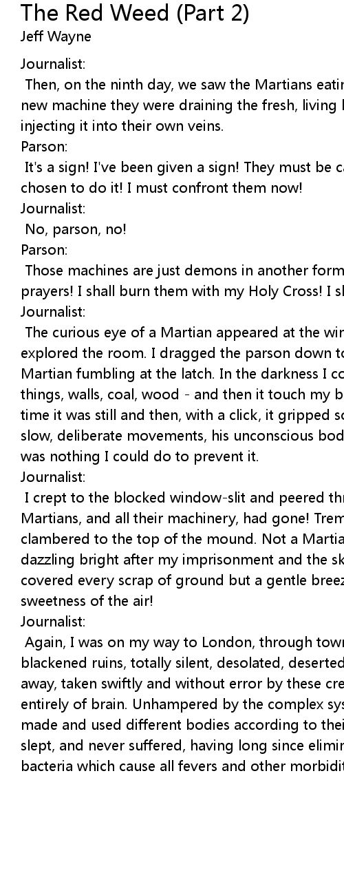I crept to the blocked window-slit and peered through the creeper. The Martians, and all their machinery, had gone! Trembling, I dug my way out and clambered to the top of the mound. Not a Martian in sight! The day seemed dazzling bright after my imprisonment and the sky a glowing blue. Red Weed covered every scrap of ground but a gentle breeze kept it swaying, and oh! the sweetness of the air! |