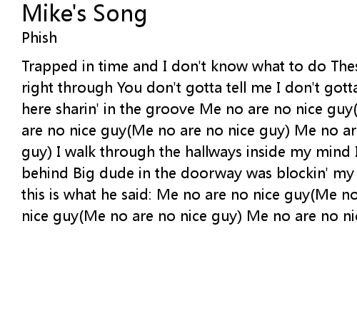 Trapped in time and I don't know what to do These friends of mine, I can see right through You don't gotta tell me I don't gotta move 'Cuz I'm sittin' back here sharin' in the groove Me no are no nice guy(Me no are no nice guy) Me no are no nice guy(Me no are no nice guy) Me no are no nice guy(Me no are no nice guy) I walk through the hallways inside my mind I chase the back-beat falling behind Big dude in the doorway was blockin' my way He reached and grabbed me and this is what he said: Me no are no nice guy(Me no are no nice guy) Me no are no nice guy(Me no are no nice guy) Me no are no nice guy(Me no are no nice guy) |