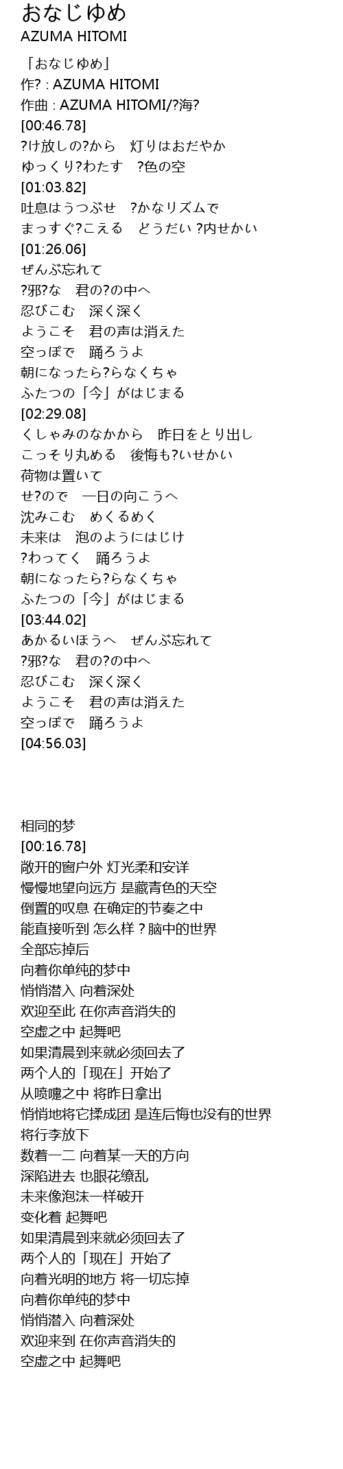 | [00:06.78] | 「おなじゆめ」 |