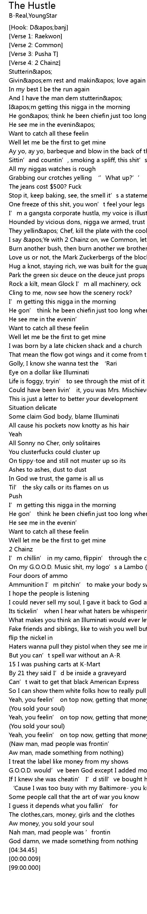 | [00:53.12] | I' m a gangsta corporate hustla, my voice is illustrious |