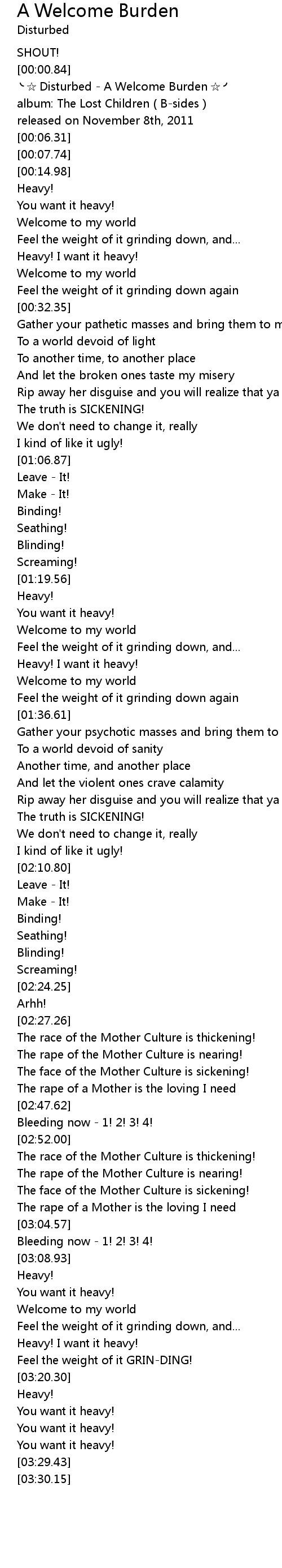 | [00:02.04] | Disturbed A Welcome Burden |