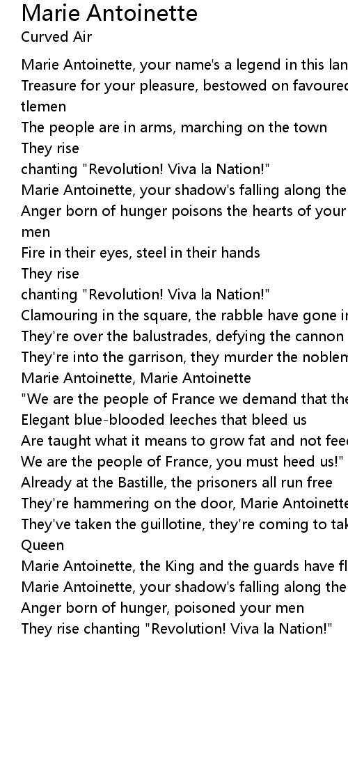 Marie Antoinette, your name's a legend in this land |