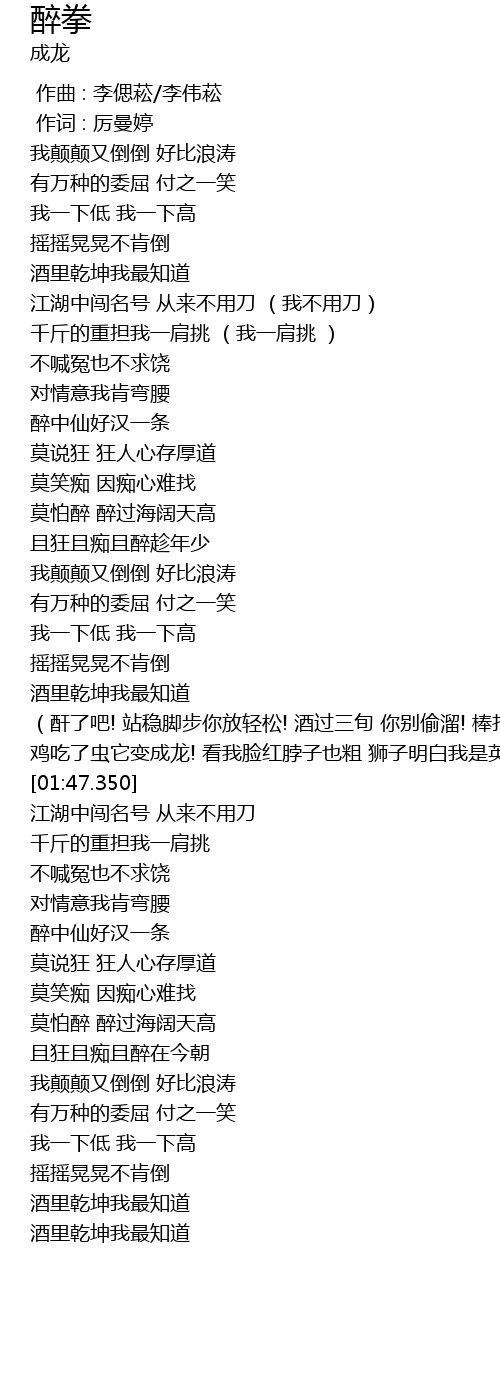 | [01:32.280] | (酐了吧! 站稳脚步你放轻松! 酒过三旬 你别偷溜! 棒打老虎 鸡吃虫! |