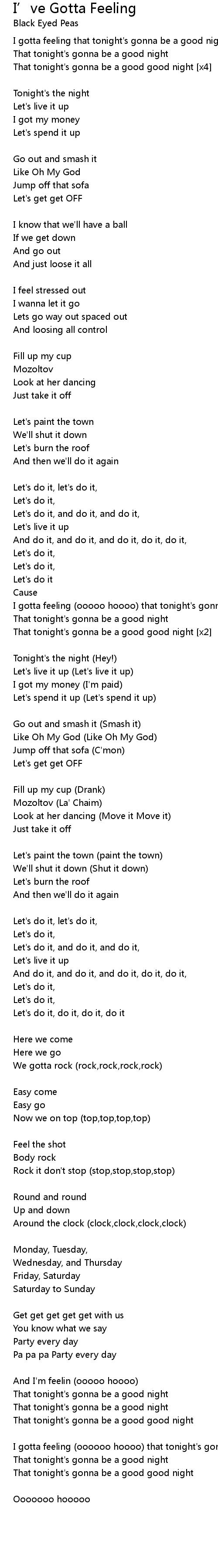 I gotta feeling (ooooo hoooo) that tonight's gonna be a good night |