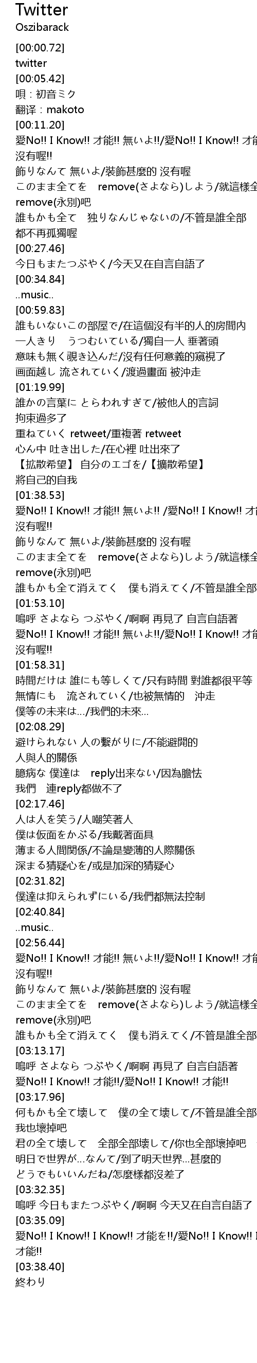 | [03:32.61] | 嗚呼 今日もまたつぶやく/啊啊 今天又在自言自語了 |