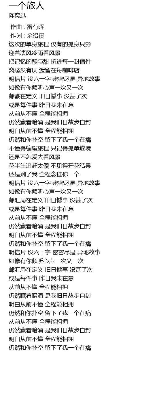 | [01:40.590] | 明信片 没六十字 密密尽是 异地故事 |