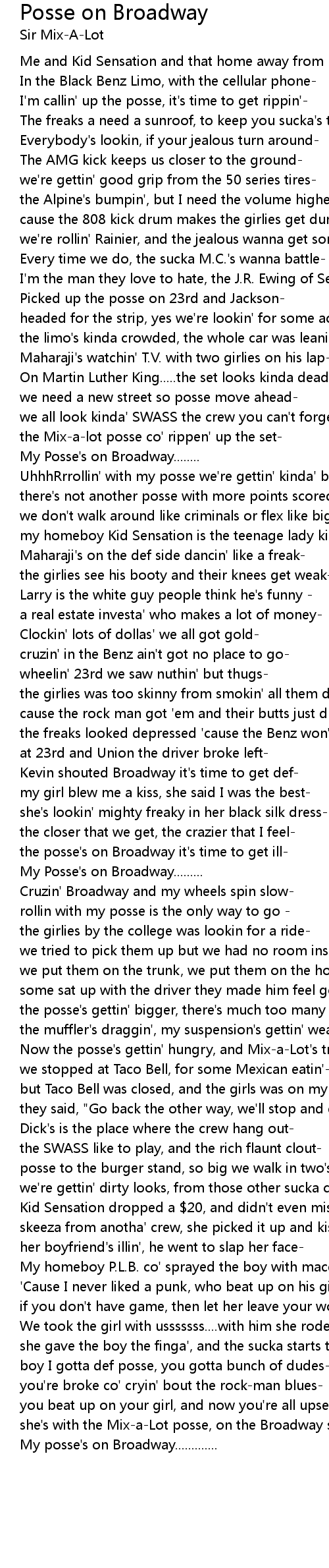 Now the posse's gettin' hungry, and Mix-a-Lot's treatin'- |