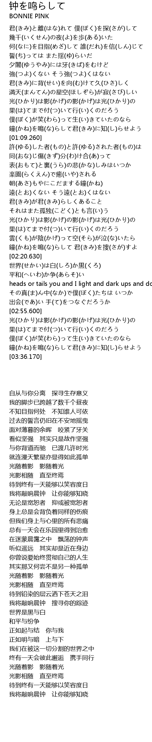 | [02:15.150] | 鐘(かね)を鳴(な)らして 君(きみ)を捜(さが)すよ |