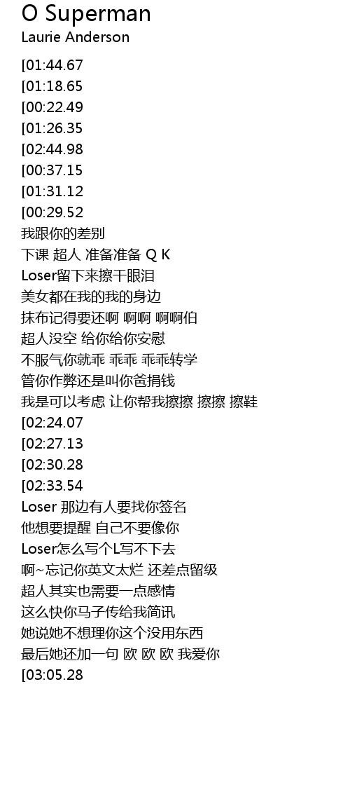 | [02:43.24][02:44.98][02:46.60][02:56.66][02:58.16][02:59.60] | year wo shi superman |