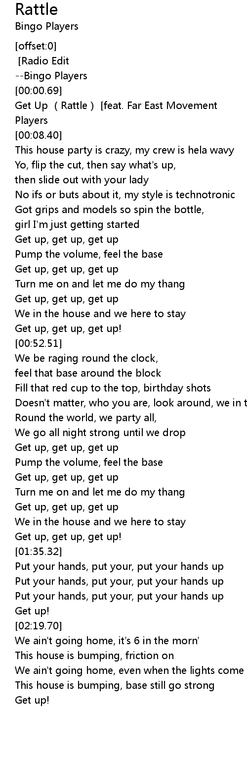 | [00:01.45]Get Up (Rattle) [feat. Far East Movement] [Radio Edit] | Bingo Players |