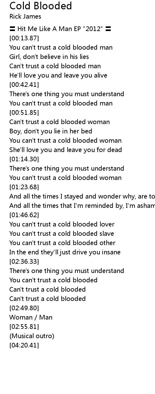 | [00:56.72] | Can' t trust a cold blooded woman |