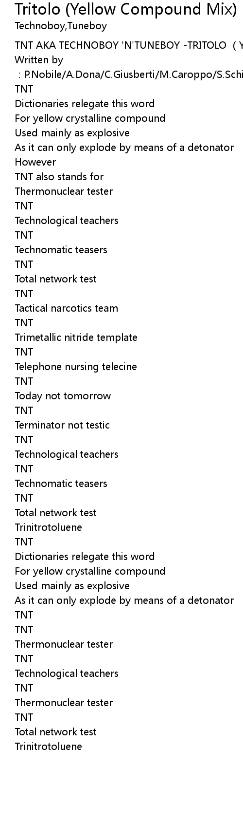 | [00:00.114] | TNT AKA TECHNOBOY 'N'TUNEBOY -TRITOLO (Yellow Compound Mix) |