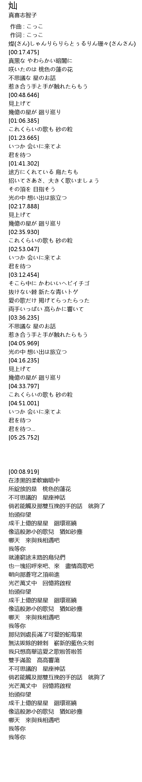 | [00:08.919] | 燦(さん)しゃんりらりらとぅるりん珊々(さんさん) |
