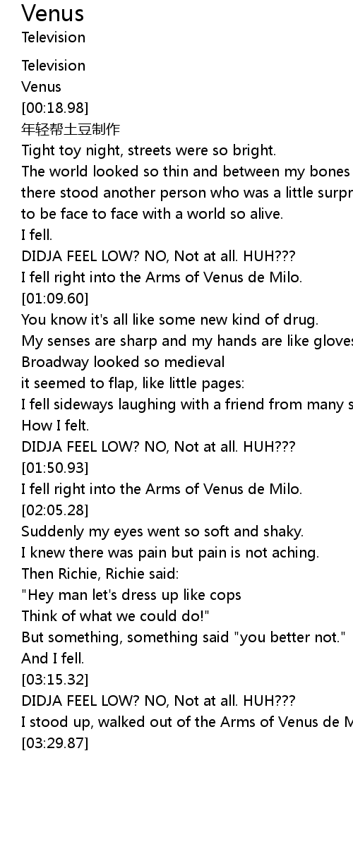 | [01:02.36] | I fell right into the Arms of Venus de Milo. |