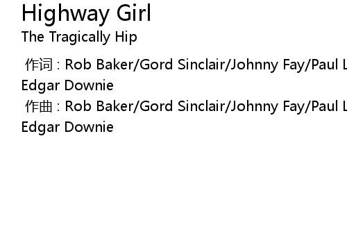 | [00:00.000] | zuo qu : Rob Baker Gord Sinclair Johnny Fay Paul Langlois Gordon Edgar Downie |