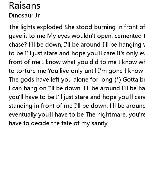 The lights exploded She stood burning in front of me She ripped my heart out and gave it to me My eyes wouldn't open, cemented to her face Have I begun a feeble chase? I'll be down, I'll be around I'll be hanging where eventually you'll have to be I'll just stare and hope you'll care It's only everything standing in front of me I know what you did to me I know what you did was wrong Your life is to torture me You live only until I'm gone I know you're diggin', you gotta be The gods have left you alone for long (*) Gotta be so that we can be Gotta be so I can hang on I'll be down, I'll be around I'll be hanging where eventually you'll have to be I'll just stare and hope you'll care It's only everything standing in front of me I'll be down, I'll be around I'll be hanging where eventually you'll have to be The nightmare, you're standing there Now you'll have to decide the fate of my sanity |