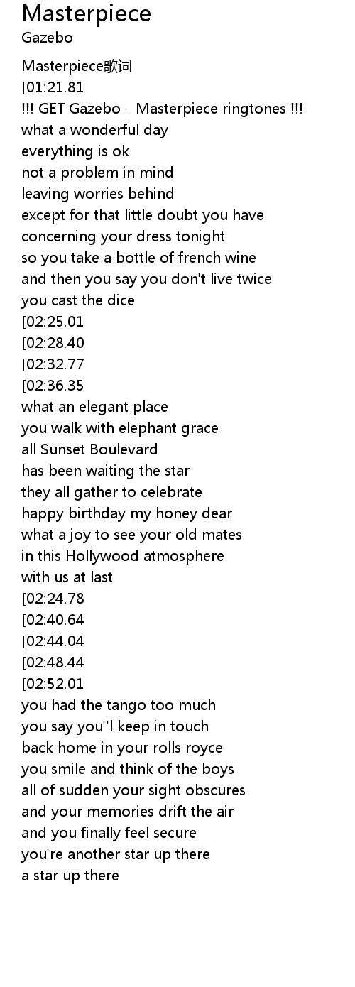 | [00:21.93] | !!! GET Gazebo - Masterpiece ringtones !!! |