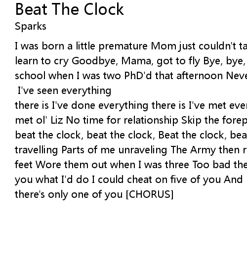 I was born a little premature Mom just couldn't take no more Had no time to learn to cry Goodbye, Mama, got to fly Bye, bye, bye, bye, bye, bye, bye Entered school when I was two PhD'd that afternoon Never entered any sports Didn't look too good in shorts Got divorced when I was four [CHORUS] I've seen everything there is I've done everything there is I've met everyone but Liz Now I've even met ol' Liz No time for relationship Skip the foreplay, let 'er rip You gotta beat the clock, beat the clock, Beat the clock, beat the clock I did lots of travelling Parts of me unraveling The Army then rejected me Said I had two flat feet Wore them out when I was three Too bad there ain't ten of you Then I'd show you what I'd do I could cheat on five of you And be faithful to you too But there's only one of you [CHORUS] |