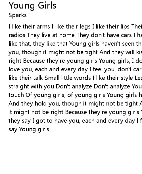 I like their arms I like their legs I like their lips Their widening hips Their radios They live at home They don't have cars I have a home I have a car They like that, they like that Young girls haven't seen the whole night And they hold you, though it might not be tight And they will kiss you, though it might not be right Because they're young girls Young girls, I don't care what they say I got love you, each and every day I feel you, don't care what they say Young girls I like their talk Small little words I like their style Less of the guile They're straight with you Don't analyze Don't analyze You've seen too much I like the touch Of young girls, of young girls Young girls haven't seen the whole night And they hold you, though it might not be tight And they will kiss you, though it might not be right Because they're young girls Young girls, I don't care what they say I got to have you, each and every day I feel you , don't care what they say Young girls