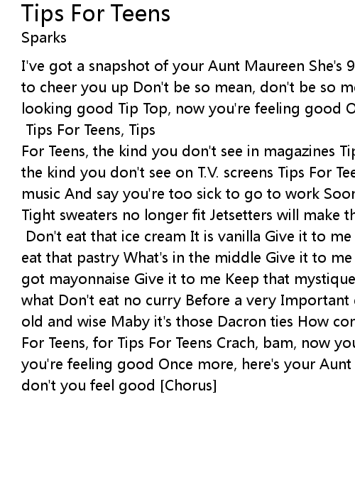 I've got a snapshot of your Aunt Maureen She's 90 and you're a teen I'm trying to cheer you up Don't be so mean, don't be so mean Crach, bam, now you're looking good Tip Top, now you're feeling good Once more, here's your Aunt Maureen Don't you feel good, don't you feel good [Chorus:] Tips For Teens, Tips For Teens, the kind you don't see in magazines Tips For Teens, Tips For Teens, the kind you don't see on T.V. screens Tips For Teens, Tips For Teens Wake up to music And say you're too sick to go to work Soon, you will lose all your zits Tight sweaters no longer fit Jetsetters will make their pitch I told you so, I told you so [Chorus] Don't eat that ice cream It is vanilla Give it to me Don't eat that pastry What's in the middle Give it to me Don't eat that burger Has it got mayonnaise Give it to me Keep that mystique up And wear a "D" cup No matter what Don't eat no curry Before a very Important date Do I look so knowing and old and wise Maby it's those Dacron ties How come you keep asking me For Tips For Teens, for Tips For Teens Crach, bam, now you're looking good Tip Top, now you're feeling good Once more, here's your Aunt Maureen Don't you feel good, don't you feel good [Chorus] |