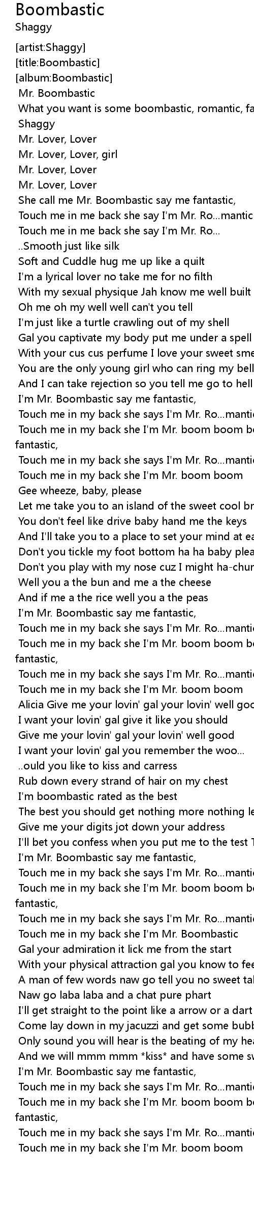 Touch me in my back she I'm Mr. boom boom boom Boombastic say me fantastic, |