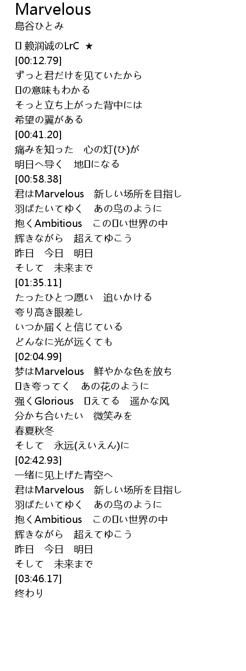 | [03:07.77] | 君はMarvelous 新しい场所を目指し |